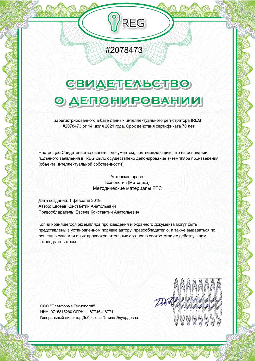Это свидетельство говорит о том, что все наши методики запатентованы и закреплены за нами авторским правом